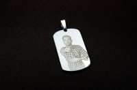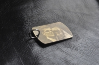 Лазерная гравировка фотографии на жетоне - задача для лазера посильная, но требует дополнительных затрат времени и труда. Поскольку мощность лазера в процессе гравировки не регулируется, передача оттенков осуществляется за счёт плотности точек. Чаще всего чтобы подобрать нужную плотность точек для максимальной передачи оттенков, необходимо сделать несколько пробных изображений и корректировку макета. Это трудоёмкая авторская работа, в результате которой получается ценный памятный сувенир.