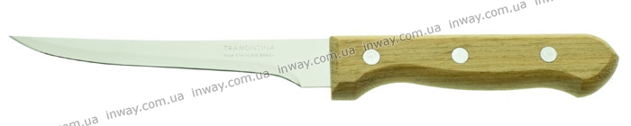 Длина общая: 23,5 см. Длина клинка: 12,5 см. Ширина клинка: 1,8 см. Толщина обуха: 0,75 мм. Материал рукояти: дерево Производитель: Tramontina (Бразилия). Вес: 110 г.