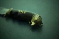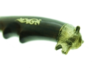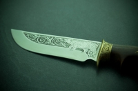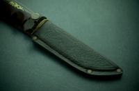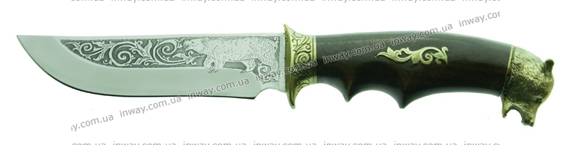 Нож "Медведь" изготовлен украинскими мастерами. На отполированном лезвии нанесено изображение медведя методом травления. Сталь прошла специальный цикл термообработки, что позволило достичь твёрдости 55-58 единиц по Роквеллу.