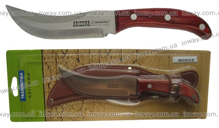 Модель: Arizona. Длина общая: 25см. Длина клинка: 13см. Толщина обуха: 3мм. Заточка: двухсторонняя (сабельная). Материал клинка: cталь 420. Материал рукояти: дерево. Материал ножен: синтетическая кожа. Вес: 167г. Производитель: Tramontina (Бразилия).